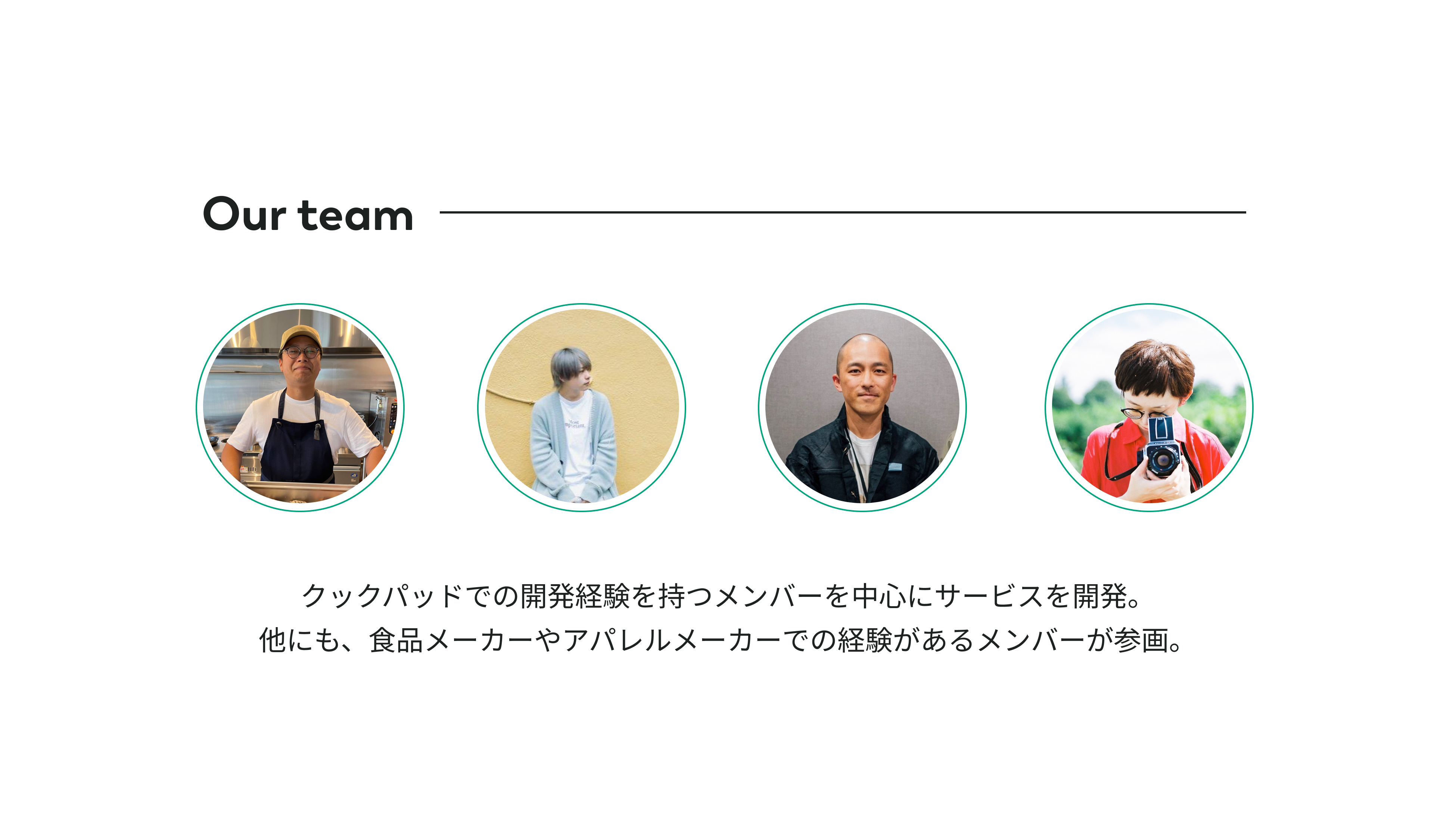 CTOやデザイナーもクックパッドでの開発経験を持つチームであり、他にも食品メーカーやアパレルメーカーの出身メンバーなどがサービス開発に携わっております。