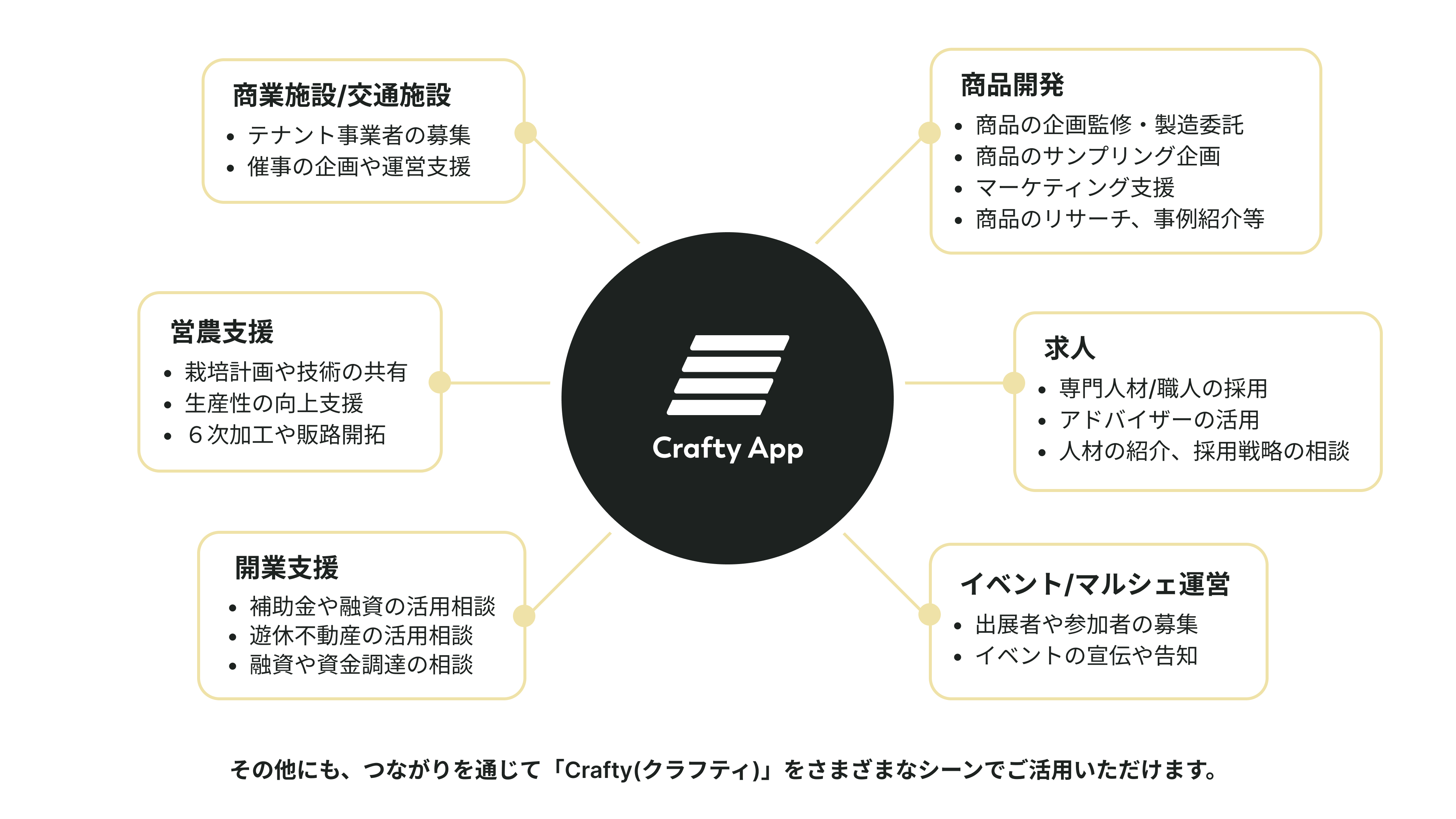 ローカルビジネスを中心とした地域での仕事に関わる職人やものづくりに関わるクリエイターは、新しい繋がりを構築する営業活動や広報活動になかなか時間を使うことができません。「Crafty(クラフティ)」を通じて作品やストーリーを発信することで、消費者だけでなく企業にも活動を伝え、新しいネットワークを広げることができます。