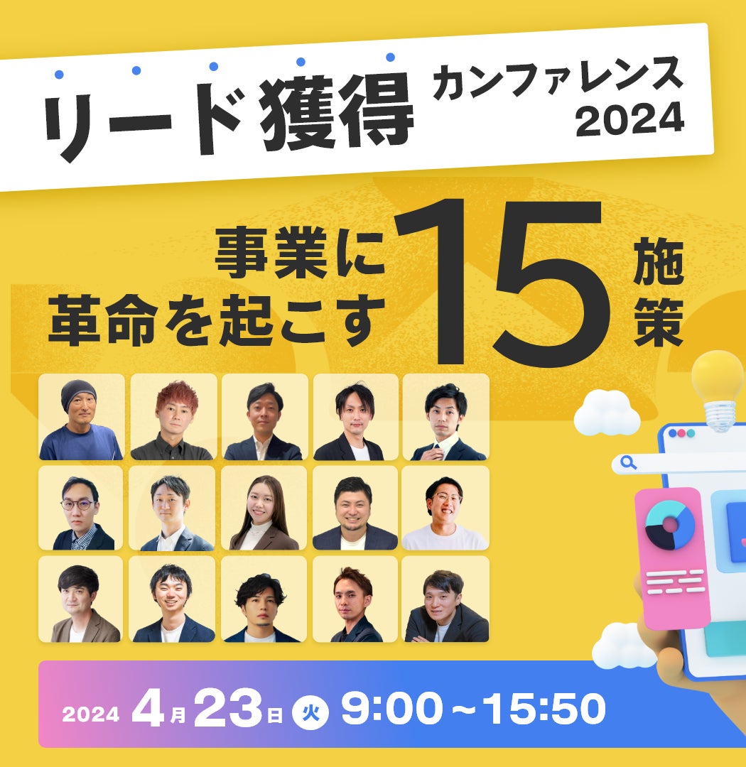 企業が売上を拡大するために「リード獲得」は必須です。一方で、自社にはどのようなリード獲得施策が合って いるのだろうかと、お悩みの企業担当者様も多いのではないでしょうか。今回は、リード獲得のプロフェッショナ ルの15社が集結し、2024年最大級といえる「リード獲得」をテーマにしたカンファレンス(オンラインセミナー)を 開催いたします。 1日で網羅的にリード獲得施策をインプットできる、貴重な機会です。ぜひご参加くださいませ。