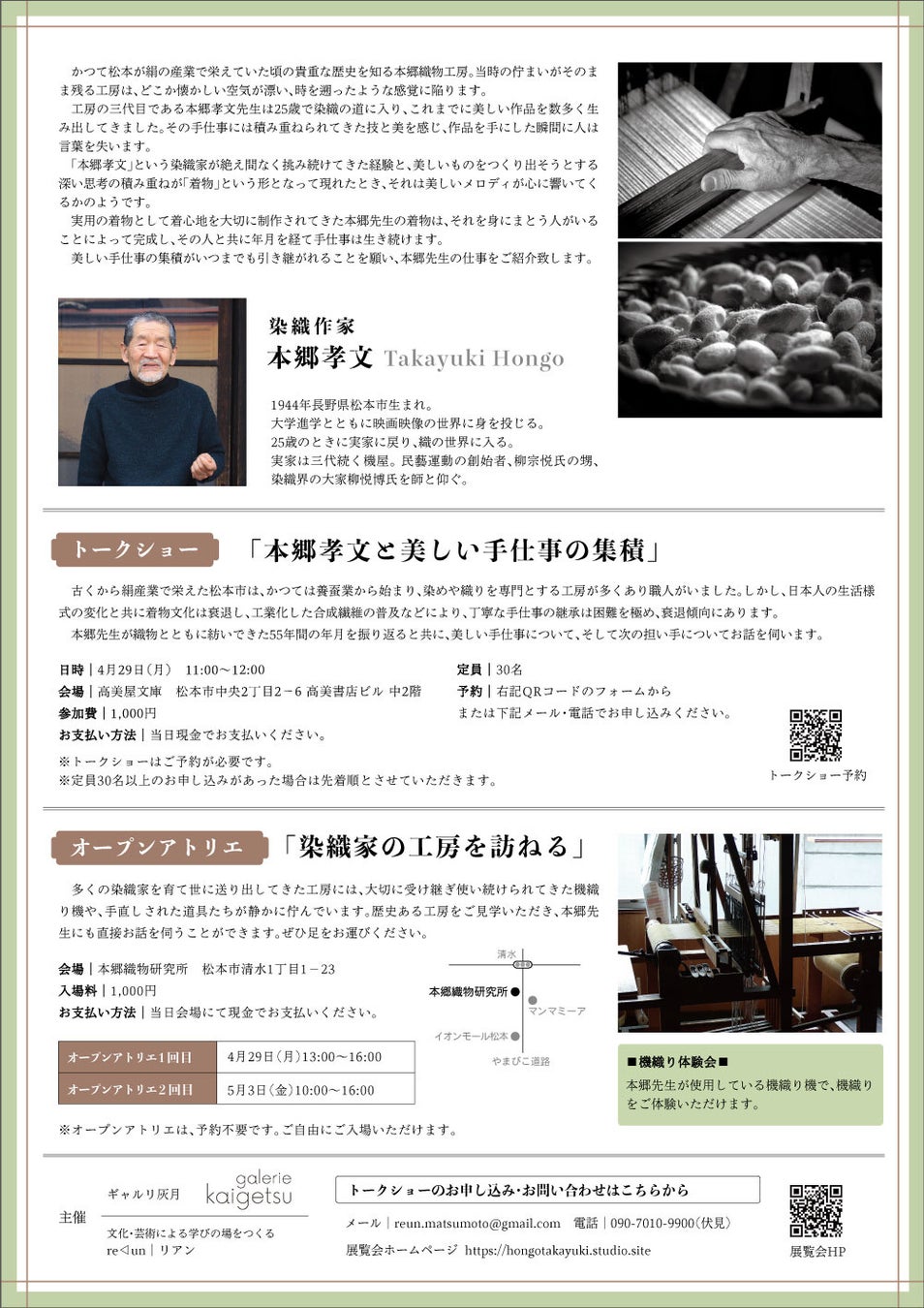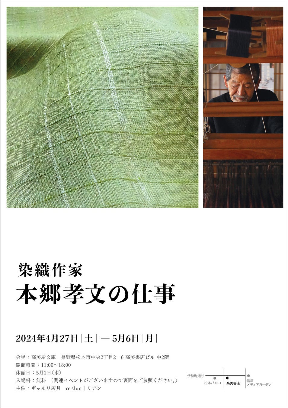 工芸の五月関連イベント【染織作家 本郷孝文の仕事】2024年4月27日(土)〜5月6日(月・祝)長野県松本市にて展覧会を開催