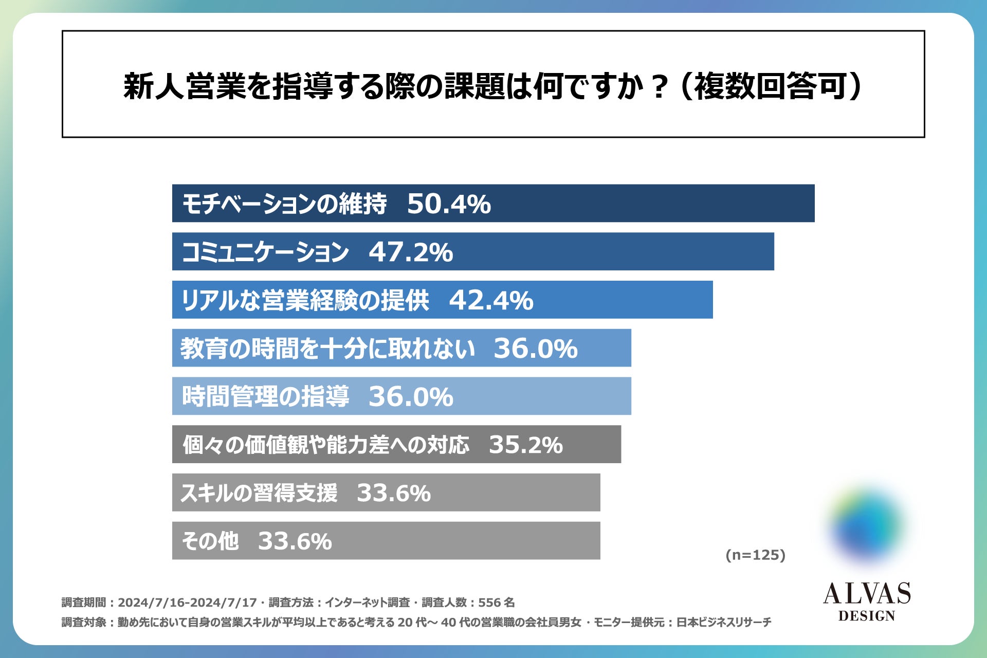 最後に、前項の質問で「新人の教育」が課題であると回答された方に対して、「新人営業を指導する際の課題は何か」を尋ねる設問の回答では1位が「モチベーションの維持」で50.4%、2位が「コミュニケーション」で47.2%、3位が「リアルな営業経験の提供」で42.4%、4位が同率で「教育の時間を十分に取れない」と「時間管理の指導」で36.0%という結果となりました。多くの項目に広く回答が分散していることから、一人前の営業職の方々でも新人指導においては、様々な課題を感じていることがこの結果から明らかになりました。