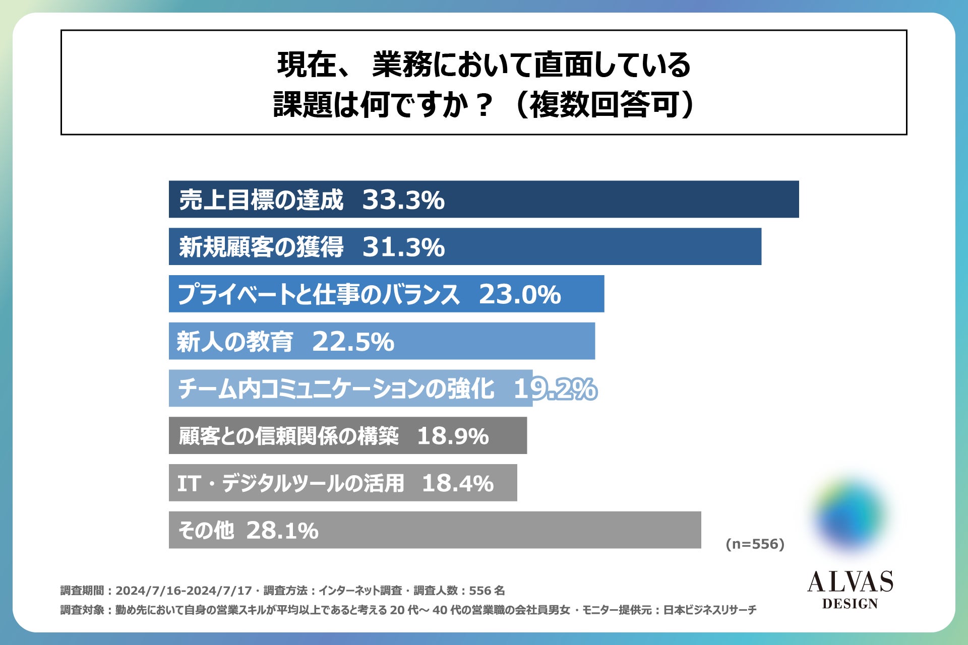 次に、「現在、業務において直面している課題は何か」を尋ねる設問の回答では、1位が「売上目標の達成」で33.3%、2位が「新規顧客の獲得」で31.3%、3位が「プライベートと仕事のバランス」で23.0%となりました。また、僅差で4位に「新人の教育」が22.5%と続く結果となり、自身が一人前になった後には、自分の外側にある「新人の教育」も課題と感じている方が一定数いることが明らかになりました。