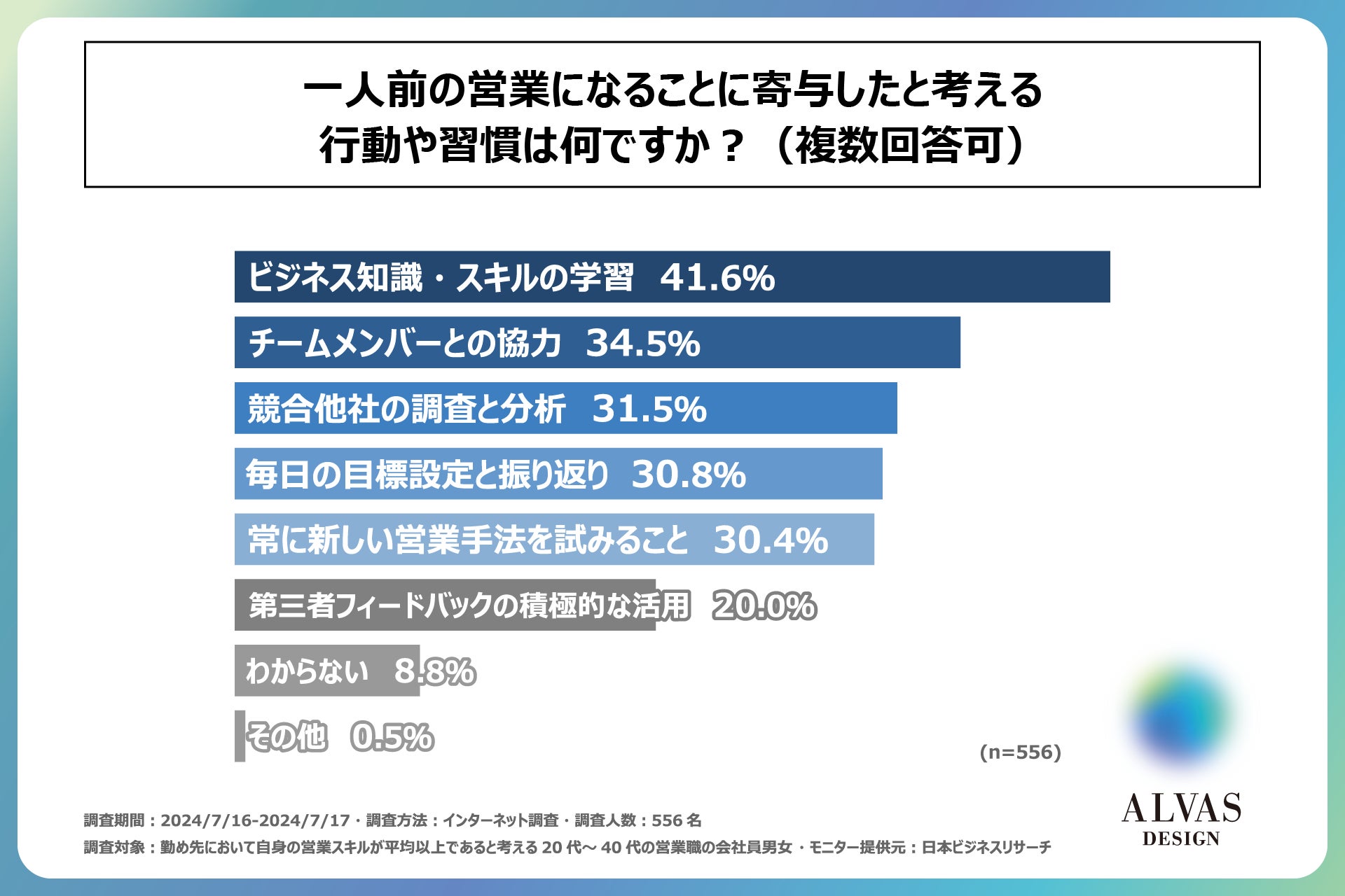次に、「一人前の営業になることに寄与したと考える行動や習慣は何か」を尋ねる設問の回答では、1位が「ビジネス知識・スキルの学習」で41.6%、2位が「チームメンバーとの協力」で34.5%、3位が「競合他社の調査と分析」で31.5%、4位が「毎日の目標設定と振り返り」で30.8%、5位が「常に新しい営業手法を試みること」で30.4%となり、5位までの回答が回答率30%を上回る形となりました。この結果から、営業職としてのスキルアップのためには様々な行動が必要となることが判明しました。
