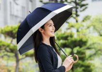 すべての商品の要となる生地に徹底的にこだわっており、特殊加工技術が可能な限られた国内工場で製造しています。紫外線吸収剤を使用したUVカット加工生地が1-2年で効果が劣化するのとは異なり、生地そのものが100%遮光構造のため、生地が破れない限り、遮光性能を長期的にキープすることができます。また日傘の裏地をブラックラミネート加工することにより、上からの光のみならず地面からの照り返しも防ぎ、涼しく目に優しい商品を実現しています。