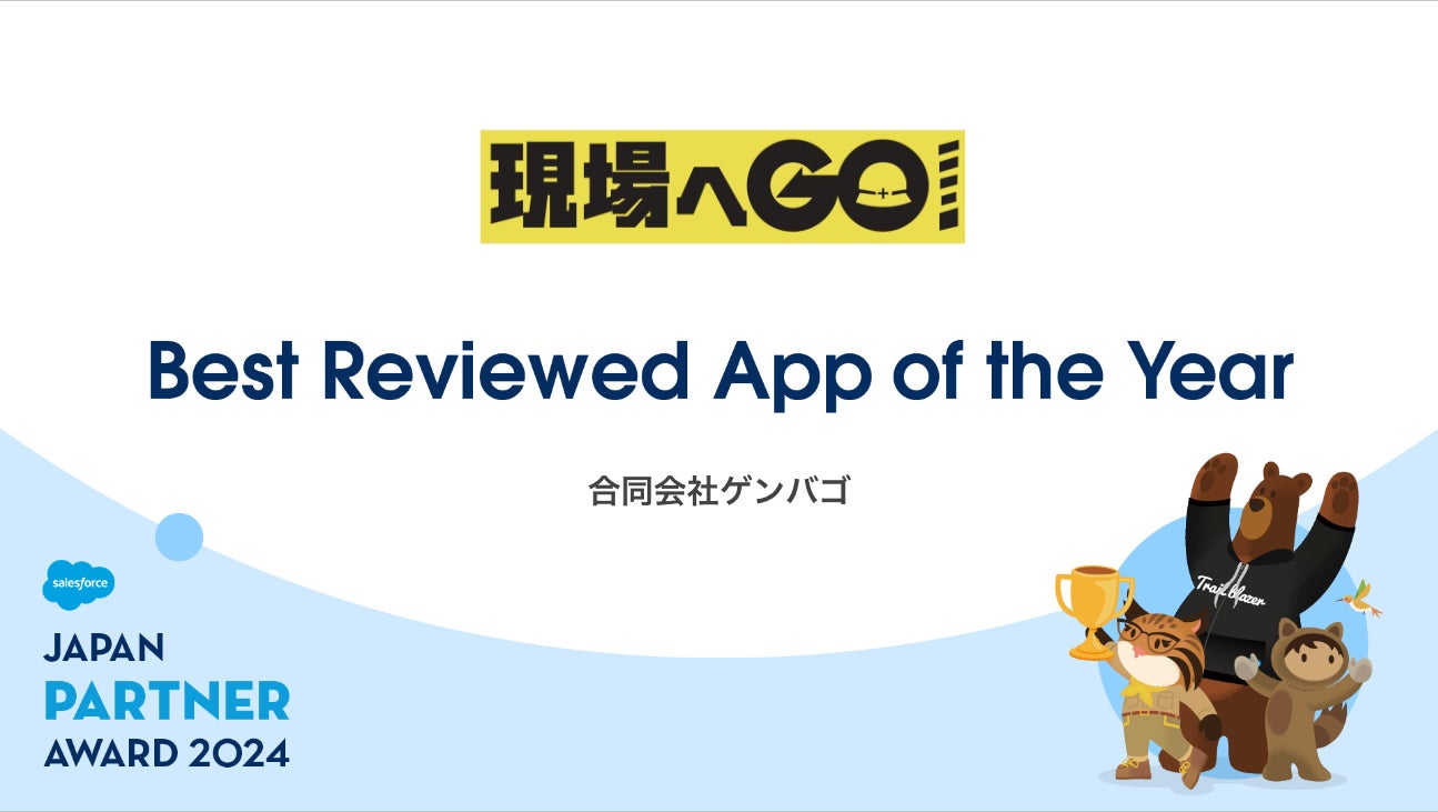 合同会社ゲンバゴ(本社:京都府下京区、代表社員:山田 遥加、以下 ゲンバゴ)が提供する「現場へGO!」は、Salesforce Japan Partner Award 2024における「Customer Success 部門 Best Reviewed App of the Year」を受賞しました。受賞理由として、「現場へGO!」がAppExchangeサイトでのユーザレビュー数の平均評価が最も高かったことを評価いただきました。