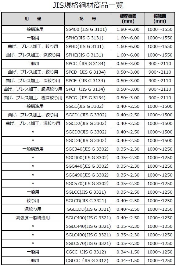 JIS規格鋼材生産認定工場を有する中国大手鉄鋼メーカー鞍山鋼鉄集団公司と直接取引し、リーズナブルな価格でJIS規格鋼材を提供しています。スリット加工。シャーリング加工も対応可能で、お客様のご要望に合わせた板厚・板幅を提供できます。※下記以外の鋼材も調達可能なものがございます。ぜひお気軽にお問い合わせください。