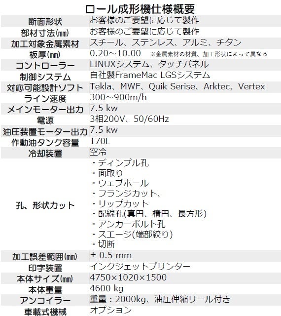 当社は冷間成形加工業界のイノベーションをサポートしており、各種形状の成形・プレカット、孔開け、部材番号の印字などが自動化されている高精度なロールフォーミングマシンを提供し、お客様の製品品質・作業効率の向上、コスト削減の実現に貢献しています。