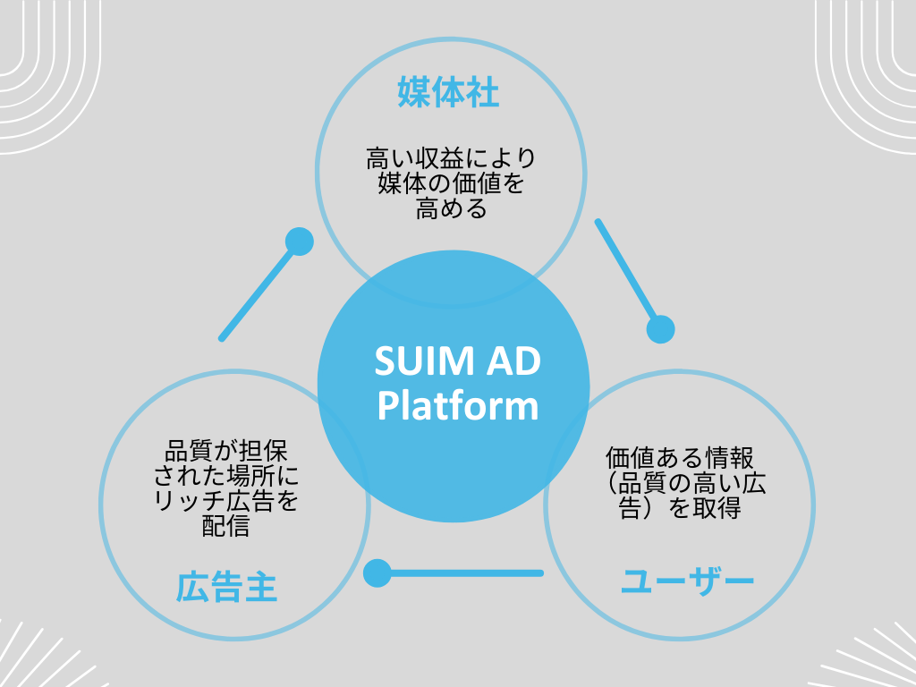 「SUIM AD Platform」を通して、品質の高い提携パブリッシャーのメディア上でブランド企業の提案力及び訴求力の高いリッチな広告を配信。ブランド価値を最大限に引き出すと同時に媒体社の収益化をサポートし、健全なネット広告のエコシステムを取り戻します。