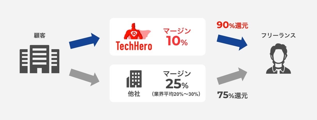 そのための一つの手段として、「弊社のマージンを固定10%」にして、フリーランスに還元することで、仲介会社のブラックボックスによる不信感を排除して、業務に最高のパフォーマンスを出していただこうと考えました。