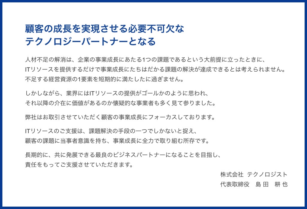 弊社では、これを推進していくための人材不足の量的課題の解決はさることながら、現在現場でITの発展を牽引しているIT企業、及びIT技術者を支援し、還元をし、さらなるテクノロジーの発展に寄与したく思います。