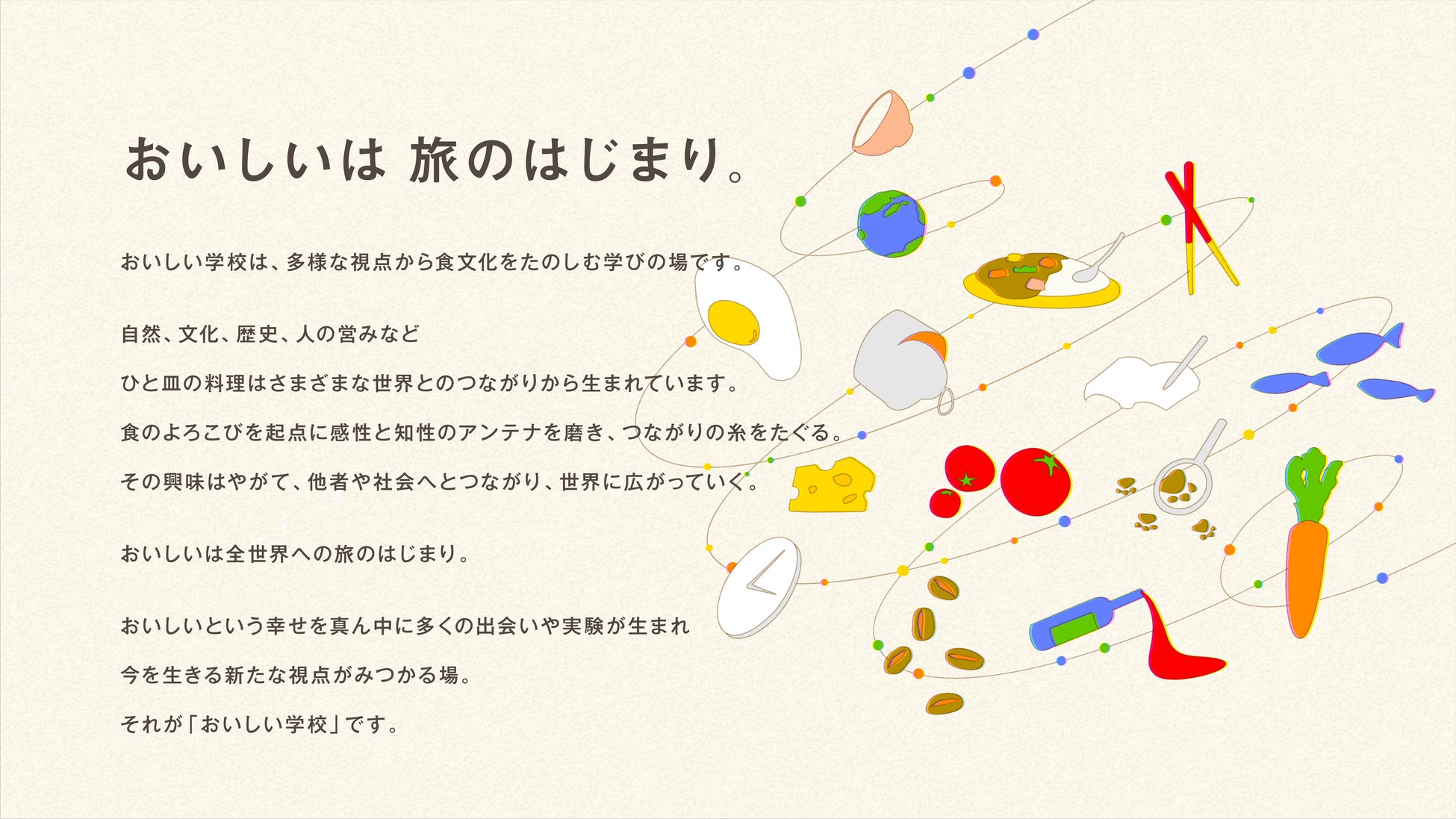 おいしい未来研究所ではこれまで、全50回以上にわたる公開講座の開催、政策提案や出版、産官学連携型の共創プロジェクトの実施等を通じて、食から考える未来を社会に提案・実施してまいりましたが、改めて「おいしい学校」として束ねることで、社会・技術・政治・生活、様々な領域と繋がっている「食」から社会を考える探求の場をつくり、人間の文化的生活と豊かな自然環境が共存する持続可能な未来に向けた活動を生み出していきます。