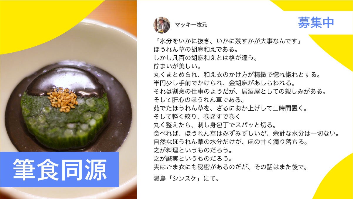 書くを通じて、食べるがもっと好きになる。普段、何気なく使う「おいしい」という言葉。でも、「おいしい」と発する前に、私たちは様々なものを受け取っています。この講義は、食の文筆家・マッキー牧元さんから文章の書き方を学び、「おいしいの言語化」を通じて自分の感じた「おいしい」を深く味わうことがテーマです。