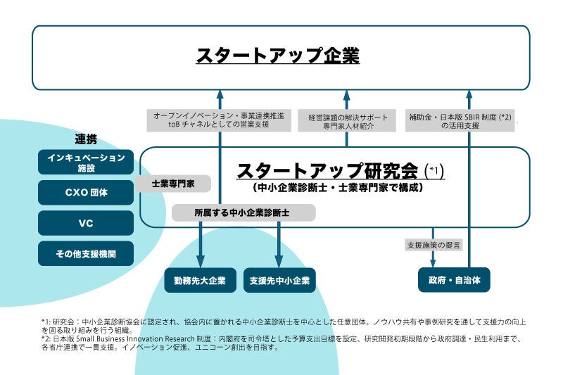 経営コンサルタントの唯一の国家資格である中小企業診断士ならではの視点で、政府施策の補助金、補助事業、SBIR(Small Business Innovation Research 中小企業技術革新制度)などの支援施策の伝道師としての役割を担い、さらには、会員のバックグラウンドを活かしたビジネスマッチング支援、経営参画人材の供給など、多様な人材を有する当研究会だからこその価値を提供し、スタートアップの成長を強く後押ししてまいります。