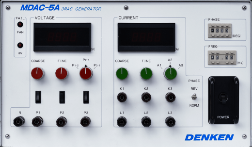 「MDAC」は、単相電源 AC100V から三相の電圧・電流を発生させ、高圧受配電盤・その他機器の調整・検査を行うことができる「虚負荷試験装置」です。