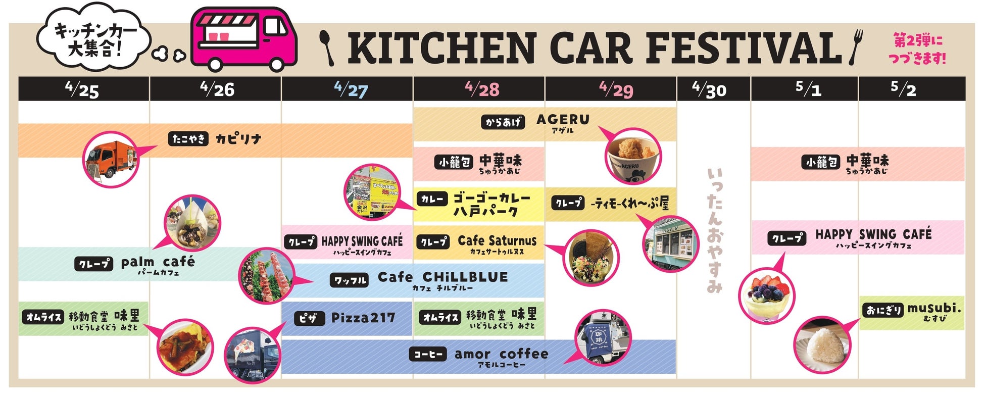 カピリナ(たこ焼き)、palm cafe(クレープ)、ゴーゴーカレー 八戸パーク(カレー)、cafe CHiLLBLUE(ワッフル)、中華味(小籠包)、HAPPY SWING Cafe(クレープ)、移動食堂 味里(オムライス)、amor coffee(コーヒー)、Cafe Saturnus(クレープ)、AGERU(からあげ)、Pizza217(ピザ)、ーティモーくれ~ぷ屋(クレープ)、musubi.(おにぎり)