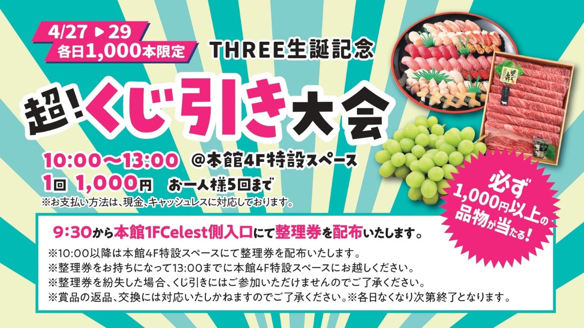 【1】初売りの際に即完売した1回1,000円の福引が「THREE生誕記念 超!くじ引き大会」としてカムバック!