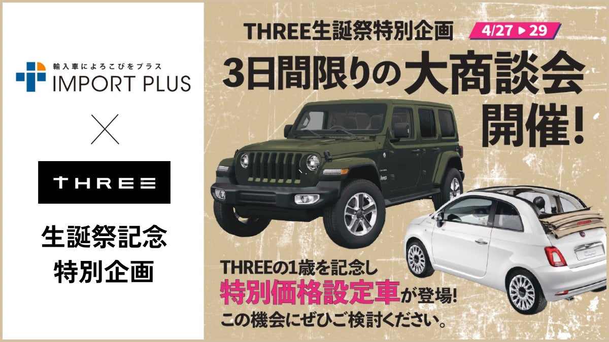 Jeep(ジープ)、FIAT(フィアット)、ALFA ROMEO(アルファ ロメオ)の人気モデルが日替わりでTHREEにやってきます。THREEの1歳を記念して特別価格設定車も登場。ぜひその魅力に触れてください。