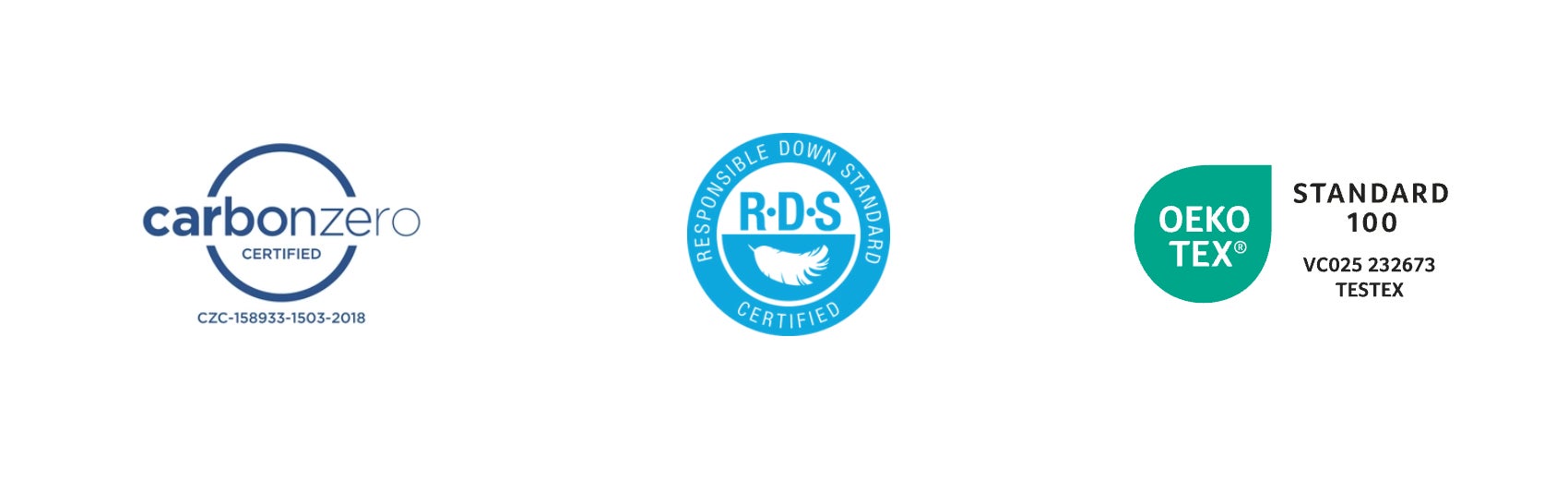 羽毛業界における主要な認証である、RESPONSIBLE DOWN STANDARD (RDS)、IDFL DOWN STANDARD(IDS)、OEKO-TEX STANDARD 100、CARBONZEROを取得しております。これらの認証は、製造流通過程においてガチョウやアヒルを人道的に取り扱い、地球環境に配慮した企業であることを証明しています。RDSとIDSの両方を取得した企業はカナダでは初めてです。
