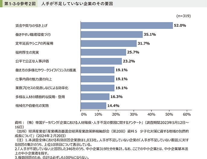 前掲の中小企業白書によれば、人手不足でない企業では、待遇改善や職場環境の整備など、さまざまな取り組みを進めていることがわかります。