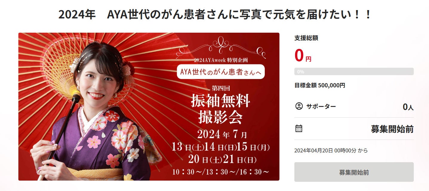 様々な配慮を必要とするがん患者さんに安心して記念写真を撮ることが出来るフォトスタジオ エヌ プラス(大阪市中央区鎗屋町/代表:西尾菜美)では、AYA世代のがん患者さんに笑顔の写真をプレゼントすることで元気になってもらいたいと、2021年に医師や看護師などを含めた「キャンサーフォトプラス」という任意団体を立ち上げ、AYA世代のがん経験者に振袖無料撮影会を2021年、2022年、2023年に開催しました。コロナ禍にも かかわらず35人の素敵な笑顔を写真に収めることが出来ました。さらに、この撮影会がキッカケで、引きこもりをしていた方が自分に自信を持てるようになってその後復職したり、次は自分が患者さんを元気にしたいとスタッフとして参加してくれたり、悪性リンパ腫を患った患者さんは、骨髄バンクの大切さなどを発信するライバーとして活躍をするようになりました。こうした活動は徐々に認知され「今年は?」と言う声も頂戴したことから、今年も7月に開催することを決めました。しかし、無料撮影会とは言え当然費用がかかります。そこで、その費用を捻出するため、下記のようにクラウドファンディングを
