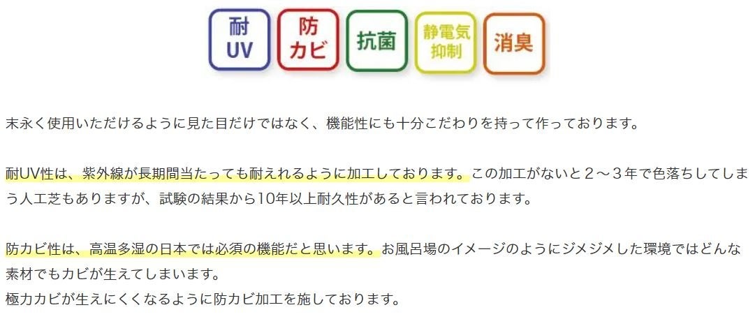 安価な人工芝との違いは、実は見た目以外の性能にもあります。長年使用することを考慮し、防カビ・抗菌の加工をしております。さらに、静電気抑制繊維を織り込んでいるので、人工芝の問題である静電気が起こりにくい仕様です。価格だけではなく、充実したエクステリアライフを過ごしたい方にお勧めです。