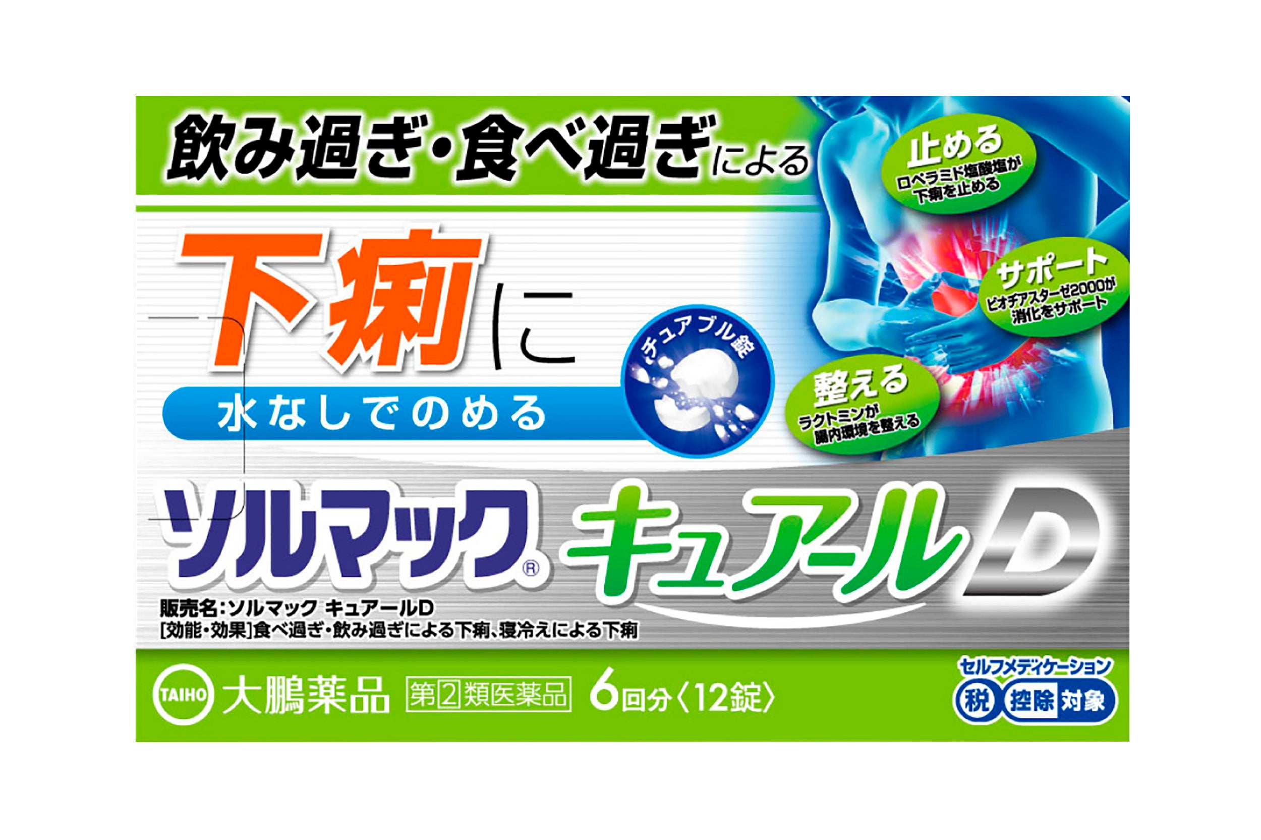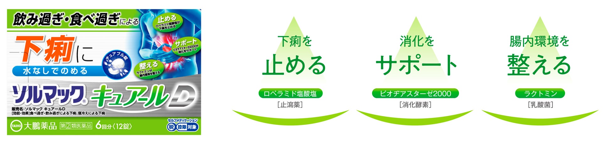 ソルマックキュアールDは、約40年以上、飲み過ぎ・食べ過ぎの症状に寄り添ってきた「ソルマックブランド」から誕生した新商品です。飲み過ぎ・食べ過ぎによる下痢にスマートに対処します。