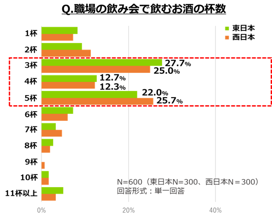 さらに、飲み会で飲むお酒の杯数についても尋ねると、東日本と西日本でそれぞれ一番多かった回答を比較すると、東日本は「3杯」(27.7%)に対して、西日本では「5杯」(25.7%)という結果になりました。