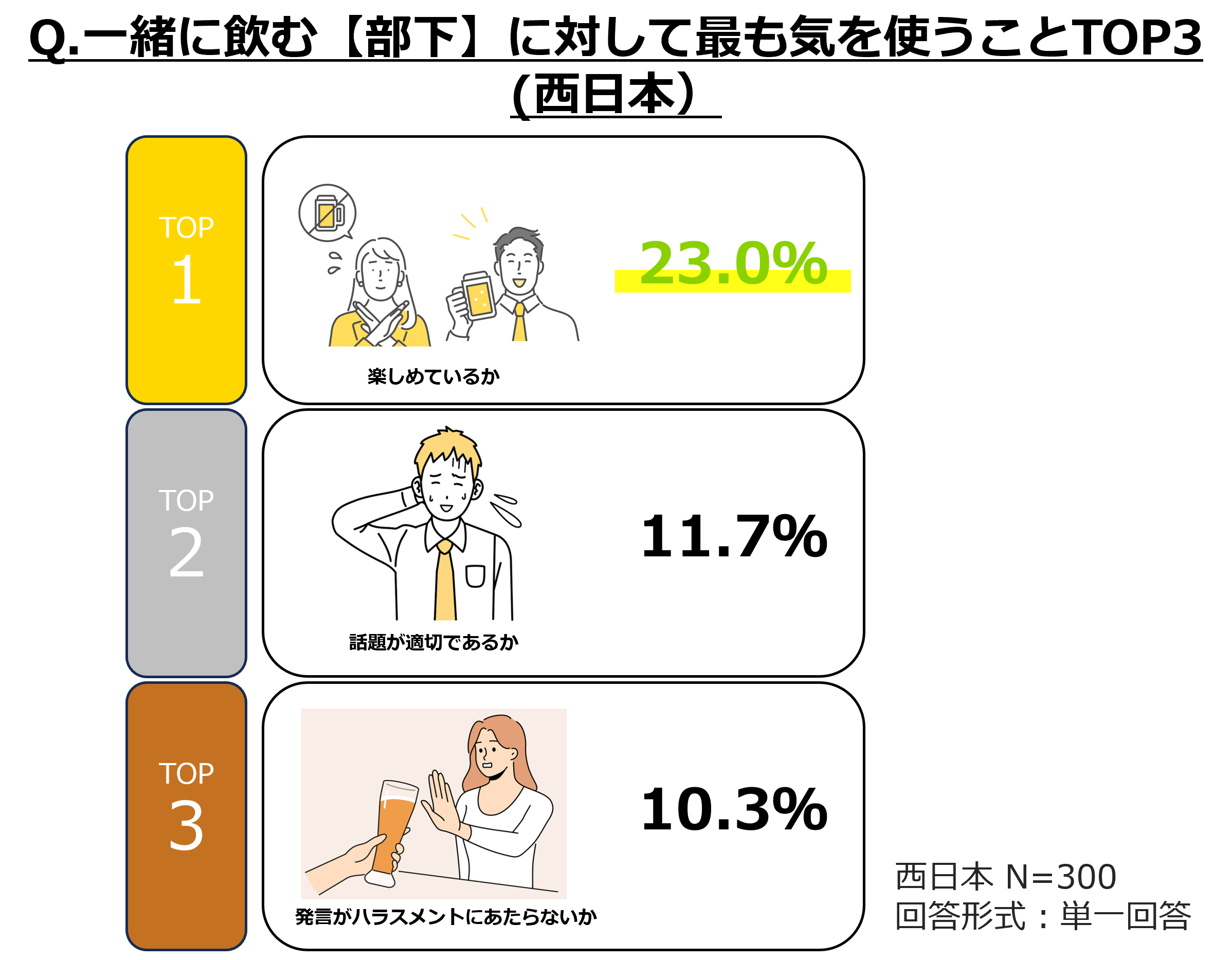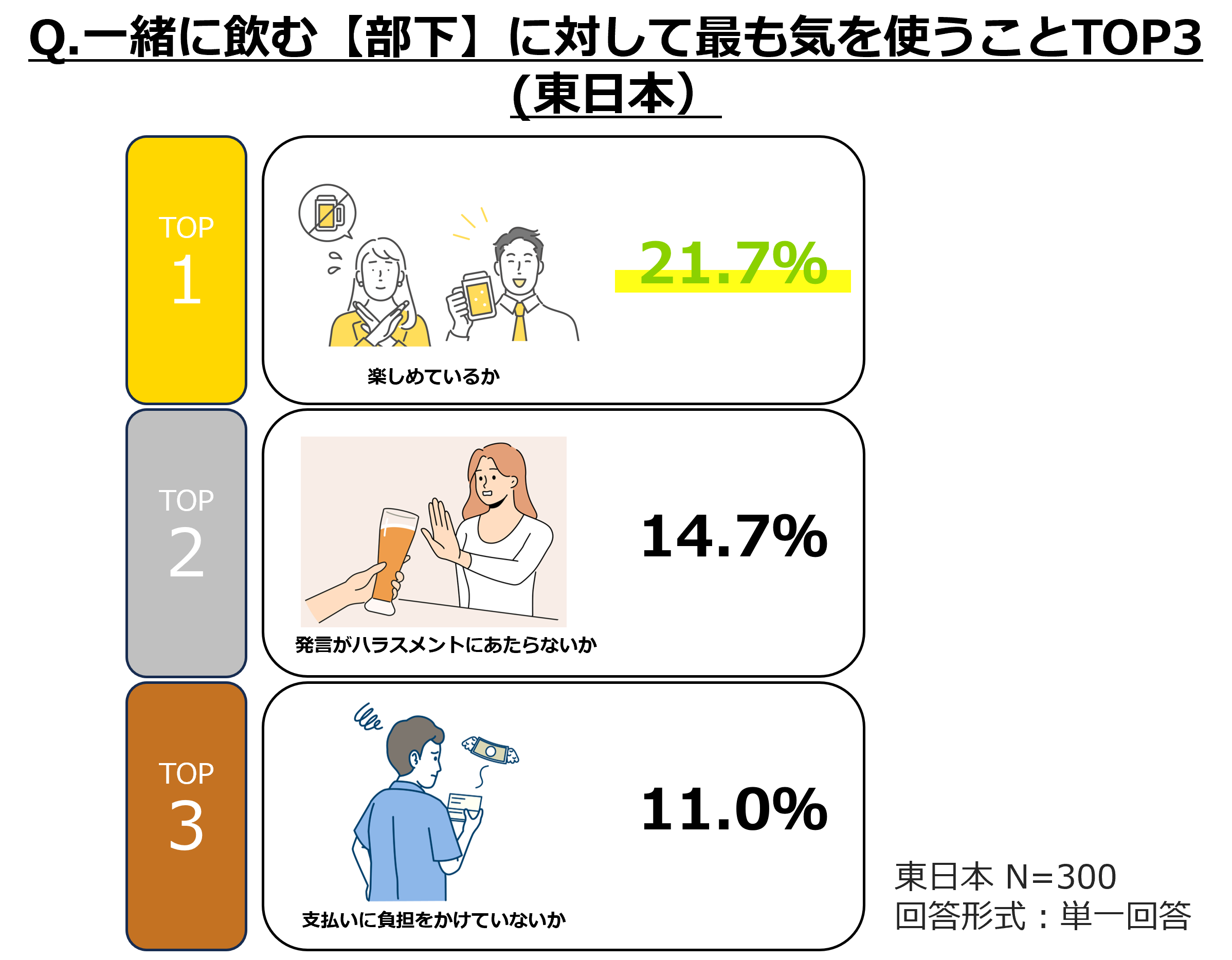 東日本と西日本共通して1位に「楽しめているか」があがったものの、東日本の2位以降は「発言がハラスメントにあたらないか」(14.7%)、「支払いに負担をかけていないか」(11.0%)に対して、西日本の2位以降は「話題が適切であるか」(11.7%)、「発言がハラスメントにあたらないか」(10.3%)という結果になりました。