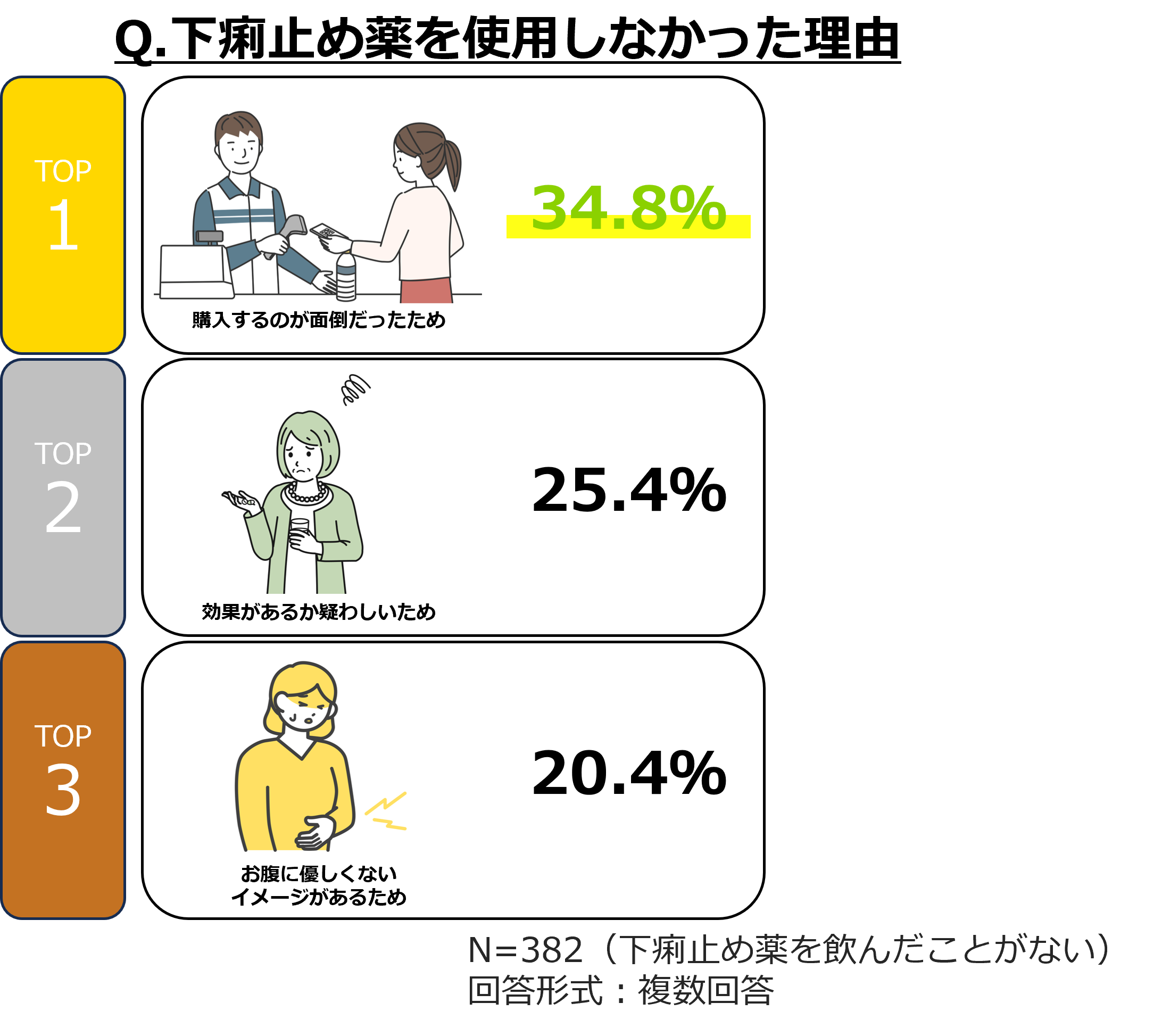 これまで下痢止め薬を使用したことがないと回答した人に、使用しなかった理由を尋ねると、最も多い回答は「購入するのが面倒だったため」(34.8%)で、続けて「効果があるか疑わしいため」(25.4%)「お腹に優しくないイメージがあるため」(20.4%)という結果になりました。