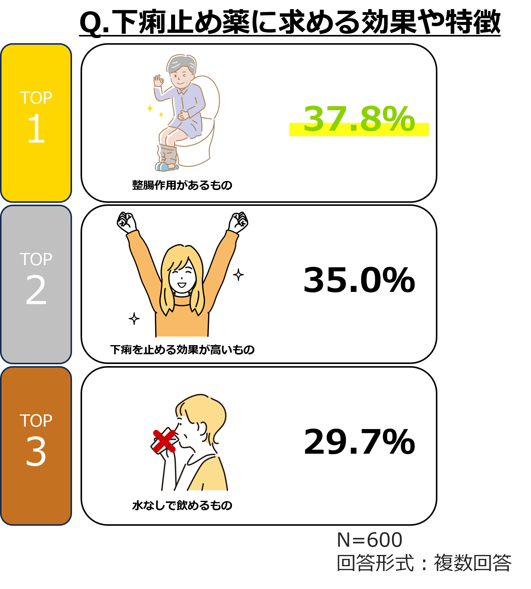 また、下痢止め薬を使うとしたらどのような効果や特徴があるものがよいか尋ねると、最も多い回答は「整腸作用のあるもの」(37.8%)となり、次に「下痢を止める効果が高いもの」(35.0%)、「水なしで飲めるもの」(29.7%)という結果になり、意外にも、下痢を止める効果が高いものではなく、整腸作用の効果を気にする人が多いことがわかりました。