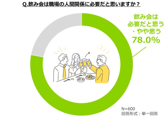 ①78.0%の人が飲み会は職場の人間関係において必要だと回答。コロナ禍が明け出社率が増え、飲み会の増加が予想される昨今、多くの人が人間関係において飲み会が必要だと感じていることが明らかに。