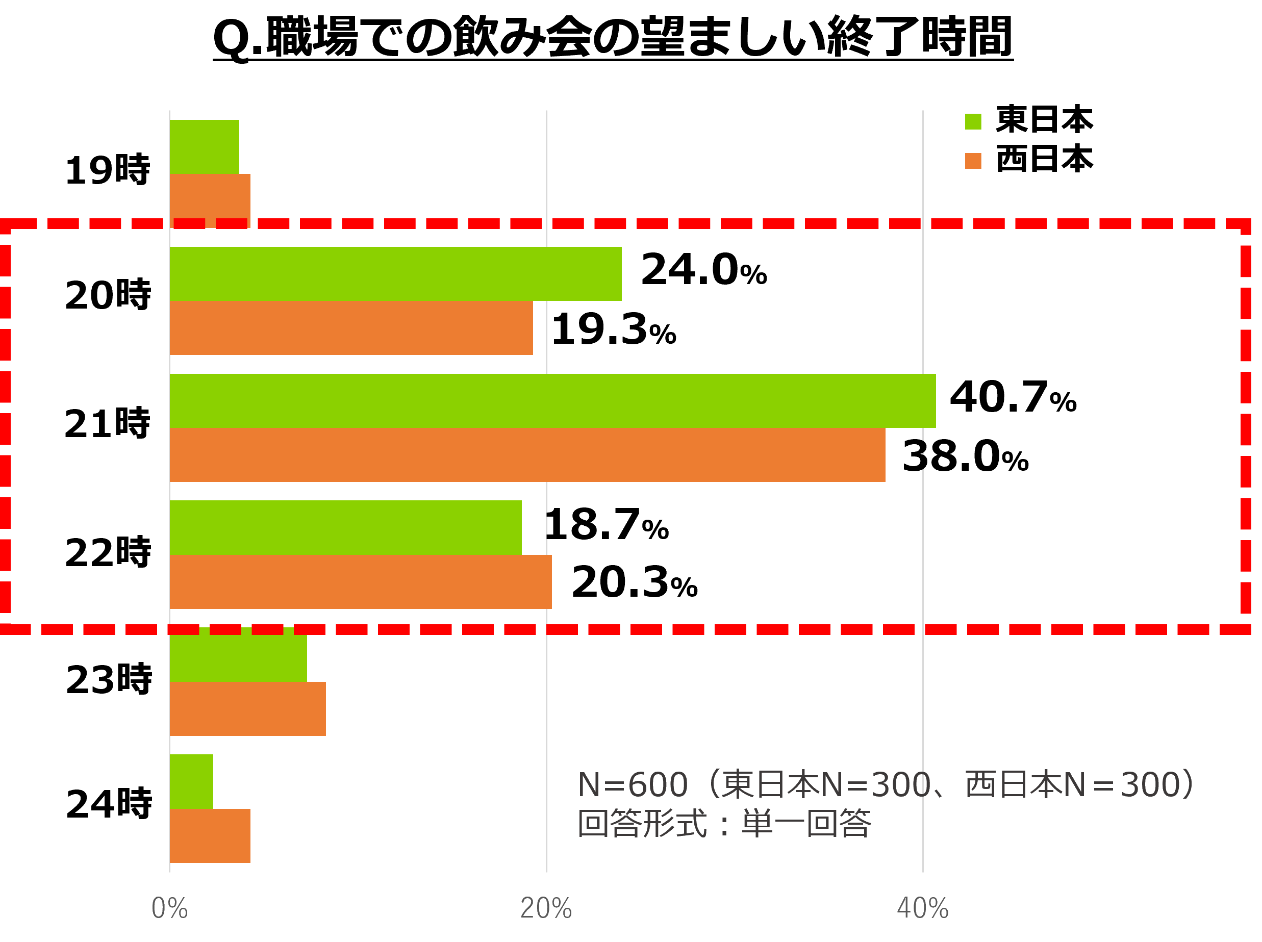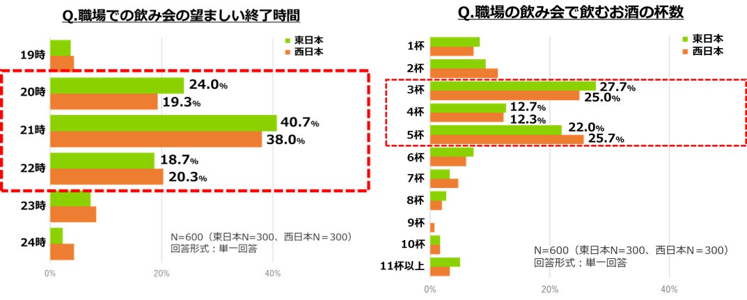 東日本と西日本で飲み会の望ましい終了時間を尋ねると、どちらも21時が最も望ましいと回答。しかし、東日本と西日本で2番目に多かった回答では、東日本は「20時」(24.0%)が多い一方で、西日本では「22時」(20.3%)が多い結果になりました。