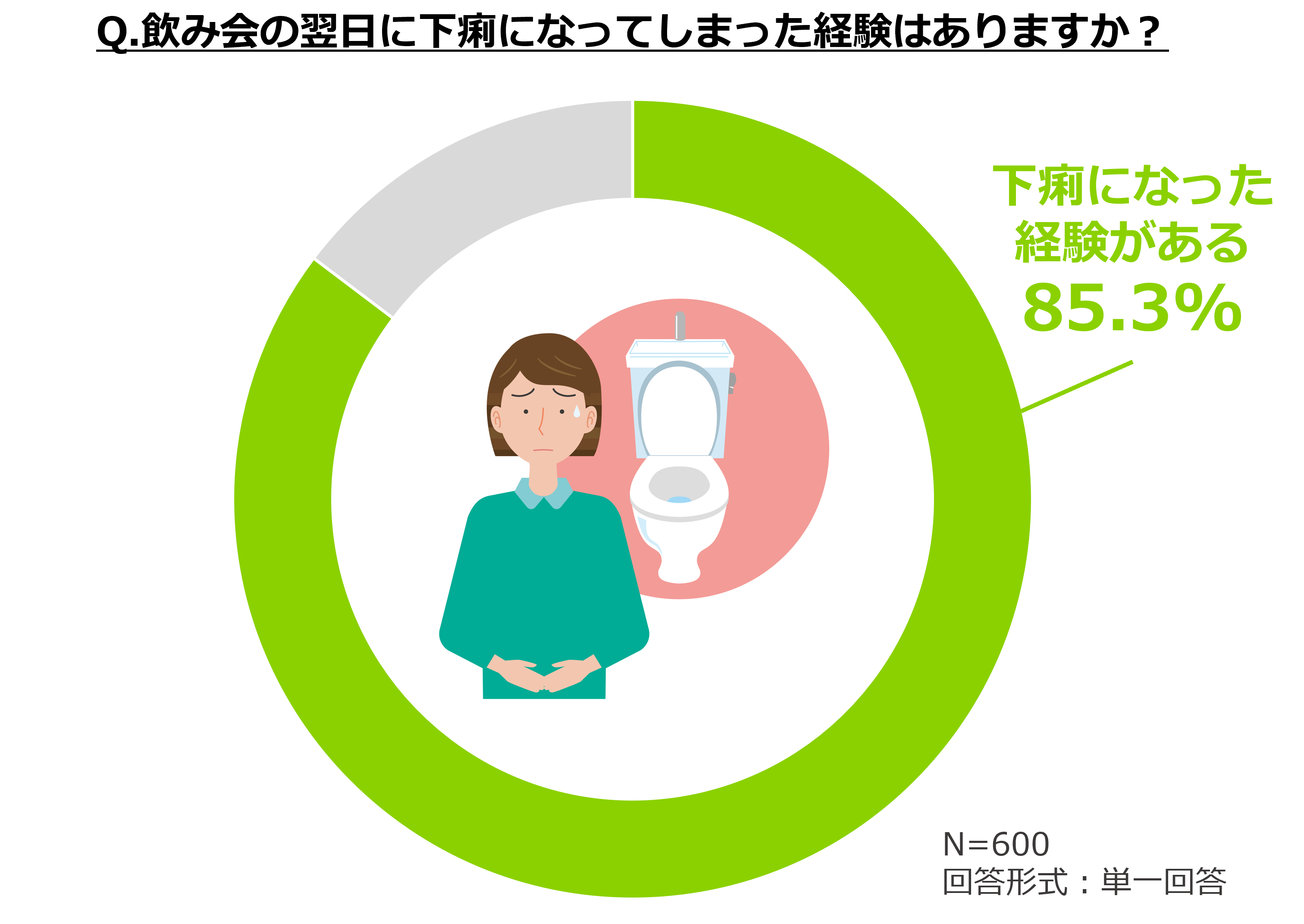 ⑤85.3%が飲み会の翌日に下痢になった経験があると回答。多くの人が飲み会の翌日、下痢に悩まされた経験があることがわかりました。しかし、 33.8%が下痢になったとき特に対処はしなかったと回答。