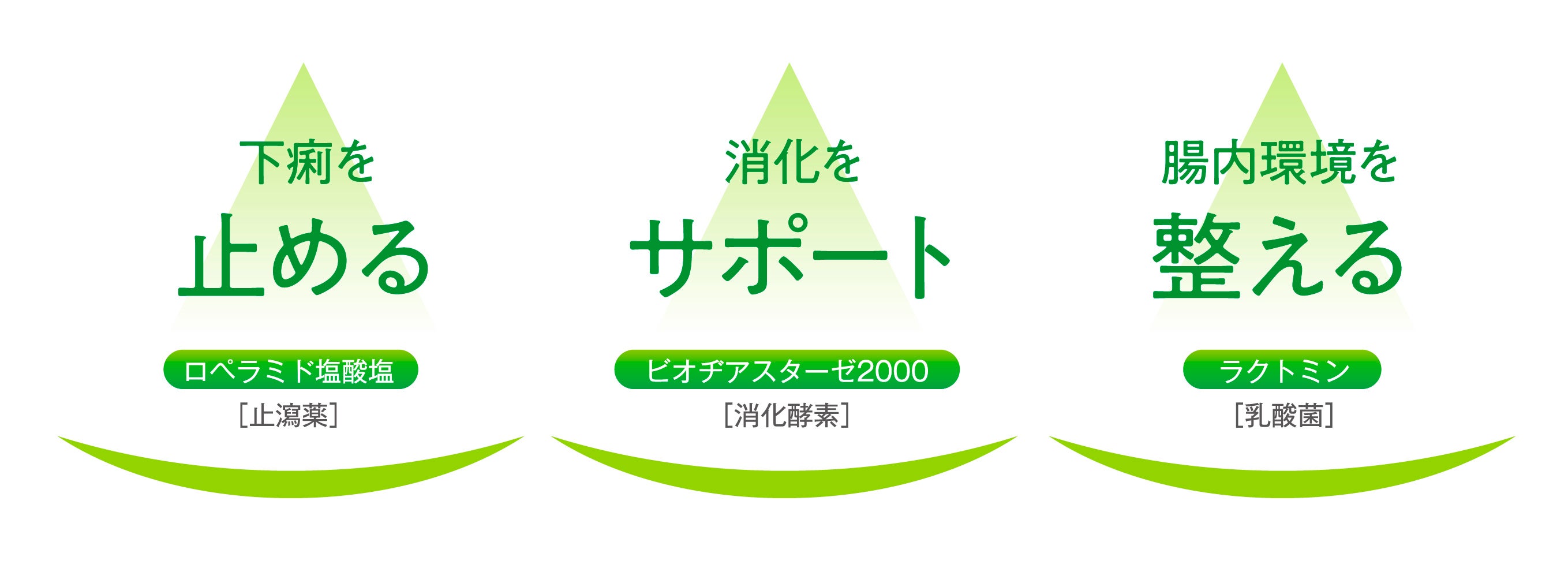 1.ロペラミド塩酸塩と消化酵素ビオヂアスターゼ2000、乳酸菌ラクトミンの3つの有効成分が下痢の症状にアプローチします。