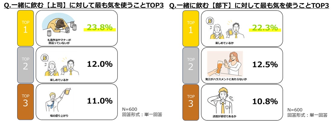 ②そんな中、職場の飲み会で上司に対して最も気を使うことの1位は「礼儀作法やマナーが間違っていないか」、一方で、部下に対して最も気を使うことの1位は「楽しめているか」という結果に。