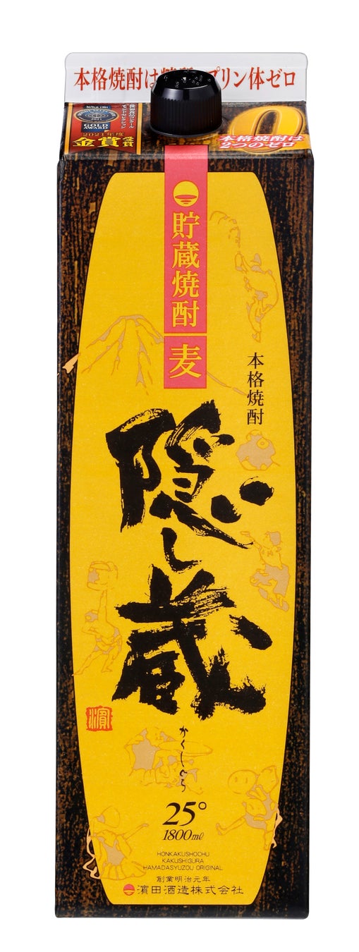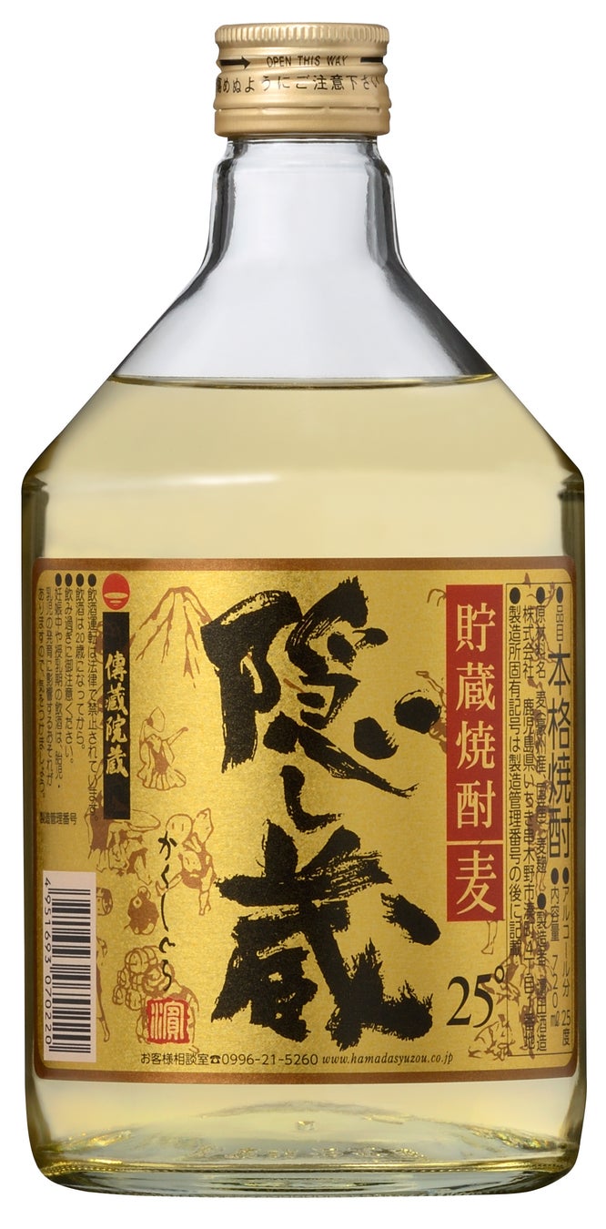 誕生したのは1994年。厳選した本格麦焼酎を樽で貯蔵熟成させた琥珀色の貯蔵麦焼酎。樽貯蔵由来のバニラのような甘い香りと香ばしい深い味わい、マイルドでなめらかな飲み口の奥に感じるほのかな甘みをお楽しみいただけます。その品質は国内のみならず、海外でも高く評価されており、国際的品評会「モンドセレクション」において「隠し蔵 25度 720ml瓶」は2005年に初出品して以降20年連続、「隠し蔵 25度 1800mlパック」は2010年の初出品以降15年連続で金賞を受賞。また海外向け商品(アルコール度数24%・容量750ml)は2019年の「ロサンゼルス国際スピリッツコンペティション(LAISC)」で焼酎カテゴリーのトップである「Best of Shochu」を受賞しております。
