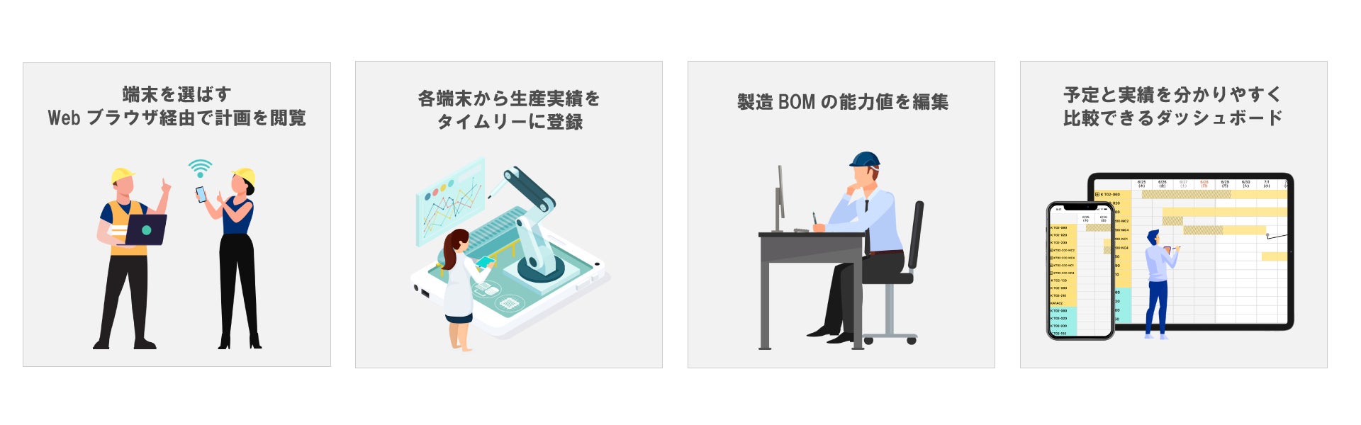 今回、当社の生産スケジューラ「Asprova」の標準機能として提供する「My Schedule」は、当社の生産スケジューラ「Asprova」で立案した計画データをパソコン以外の端末でもWebブラウザ経由で閲覧ができるため、いつでも、どこでも、誰でも、最新の計画の確認することが可能な専用Webアプリです。その他、作業実績の入力や設備の能力値調整、といった機能が実装されています。これにより、企業は導入障壁になったコストのことを気にすることなく、高精度で高速な最適化技術を持つ生産スケジューラとWebビューワの構成が利用でき、生産計画にまつわる様々な悩みの解決に支援します。