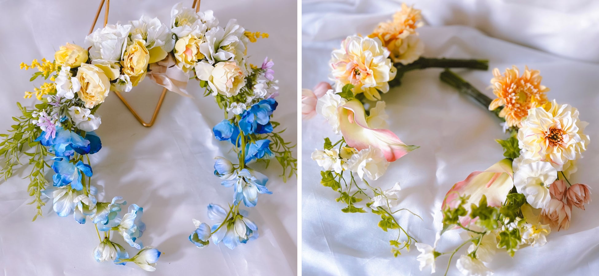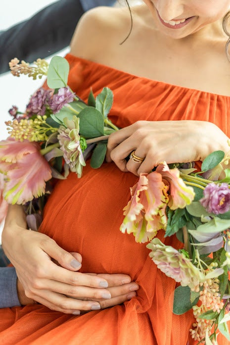 そこで&BOUQUETでは、体調に左右されず、撮りたい時にすぐに華やかなマタニティフォトが撮影でき、肌トラブルも避けられる、造花のマタニティブーケを考案しました。お腹を出すことに抵抗のある妊婦さんでも気軽に撮影出来るよう、服の上からでもお腹のふくらみが分かるように工夫した、オリジナルデザインのブーケです。