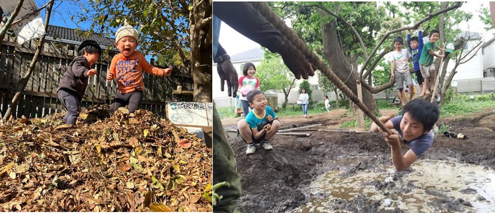 落ち葉やどろんこや自然の素材や遊び場にあるものを使って、
