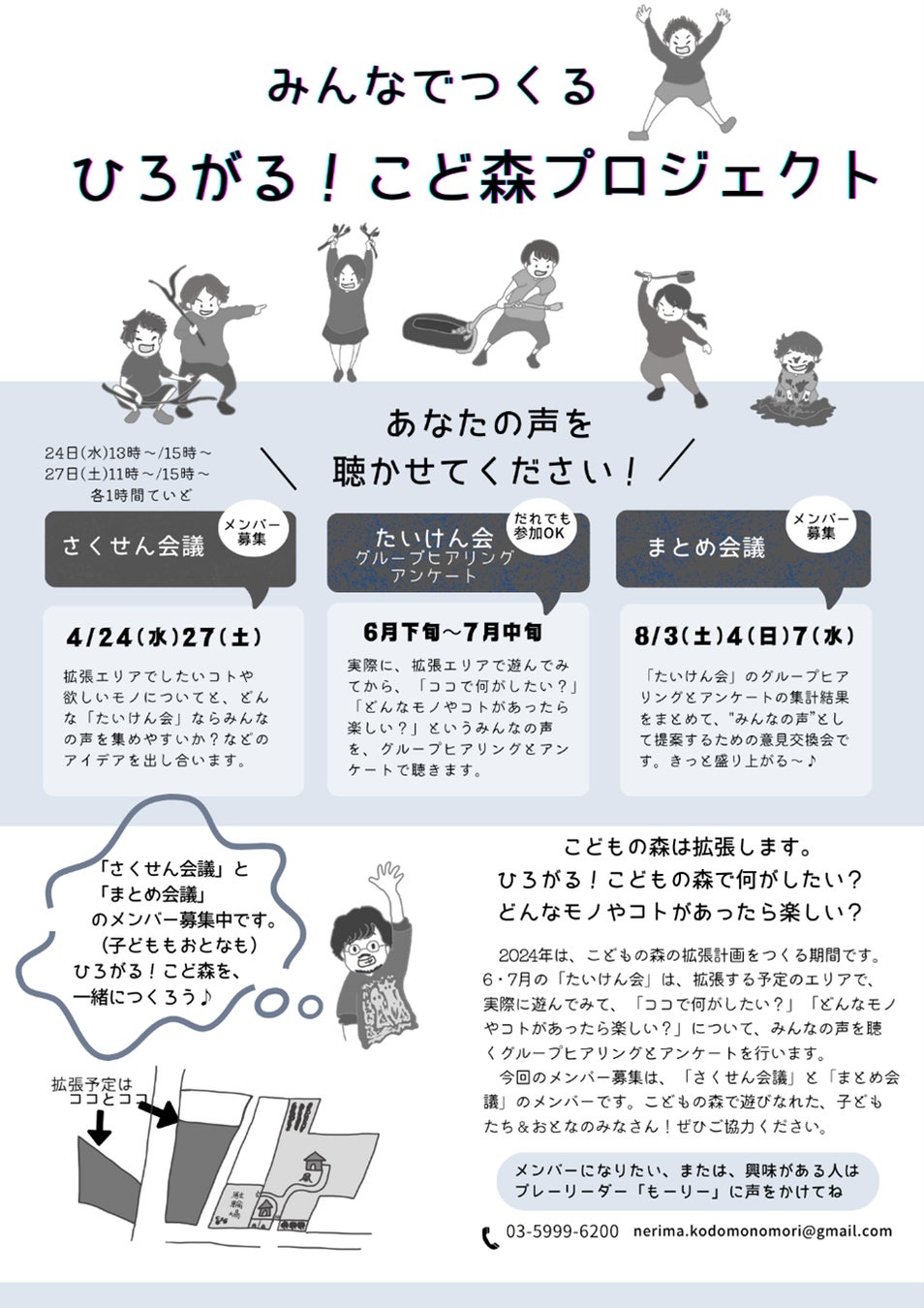 上述のような子ども・若者の声を尊重しようという社会の潮流、練馬区立こどもの森は子どもの「やってみたい!」という思いを大切にする冒険遊び場であることから、今回の拡張計画策定にあたって、子どもの声を聴き、子どもと一緒に考える必要性を強く感じております。そして、子どもたちにも、「自分たちで変えていける!」「意見を伝える意味がある!」という経験をたくさん積んでほしいという思いで、「みんなでつくる~ひろがる!こど森プロジェクト~」を、公園整備計画の改訂を支援するパシフィックコンサルタンツ株式会社と所管課である練馬区みどり推進課と共同で実施することにいたしました。