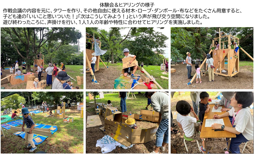 作戦会議の内容を反映させて、遊び場の環境設定を行ったうえで、7月の9日間をかけて、実際に子ども達に遊んでもらい、1人1人の子どもに「ココでなにがしたい?」「どんなモノやコトがあったら楽しい?」を聴いていきました。