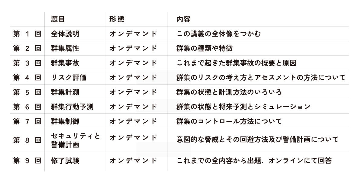講座の狙い:今日、大きなイベントで警備が行われ、様々な方法で群集の安全が守られています。しかし、その多くは経験と熟練者の知恵から来るものであり、科学的に体系化されていません。一方でAI関連技術の発展によりカメラ等の映像の分析精度が飛躍的に向上しています。今後、大規模イベントの開催、メガシティ化や超高齢化社会を迎える中で、人々の安心と満足を達成する、科学的な群集マネジメント技術は社会の基盤となっていくことが予想されます。群集の安全に携わるすべての人が群集マネジメント技術を身につけ、悲惨な群集事故を無くし、人々が集まる場所の安心と安全の向上に資することが本講座の目的です。