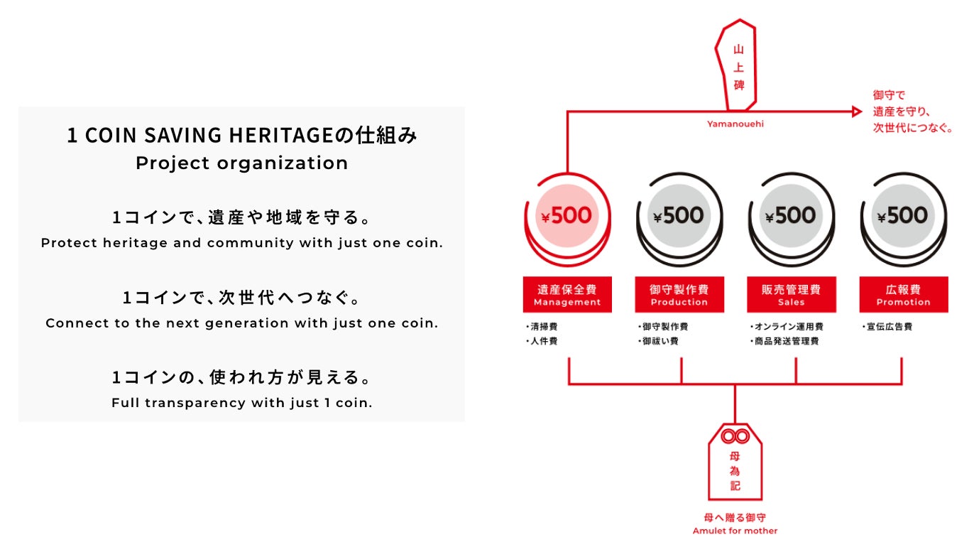 なお、山上碑保全活動「TO MOTHER -山上碑保全プロジェクト-」では、御守授与による寄付に透明性のある遺産保全の仕組み「1 COIN SAVING HERITAGE」を導入しております。御守初穂料の内訳や使われ方を開示することで、社会的透明性を持たせ、未来へつなげる遺産保全活動のモデルケースにしたいと考えています。