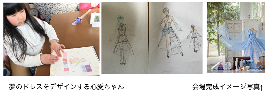 出産育児でやむをえずキャリアを絶ったママたちが、再び感性・縫製・デザイン・パタンナーの技術を活かして、あなたのデザイン、ステッチが現実になる「クリエイティブ裁縫Labo」を結成。8歳女の子が見つけた「ワタシの好き!」デザイナーになりたい!の夢を共にかなえます。イベントに向けて、取り組んできた心愛ちゃんデザインのドレスがイベント内で共に完成を目指します。