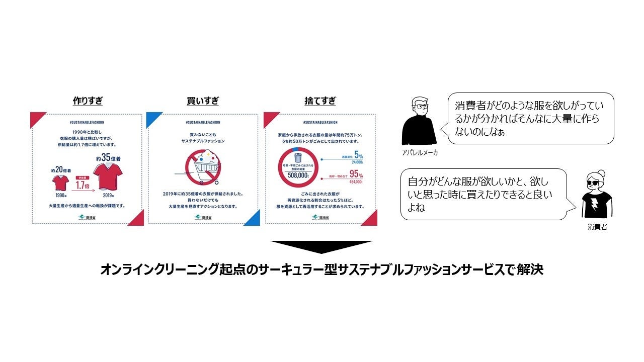 国内衣類の新規供給量は約80万トンに対し、その約6割に相当する約50万トンが廃棄されています。それはファストファッションという言葉に代表されるように、「大量に作られた服を買ってちょっと着て捨てる」といった私たちの習慣が影響しています。その結果、大量の廃棄物の排出、地球温暖化の要因となっている大量の温室効果ガスの排出、製造に使用される大量の水、といった環境悪を生み出してしまっています。そこで弊社は、作りすぎ、買いすぎ、捨てすぎ、を解決する仕組みとしてオンラインクリーニングを起点としたサーキュラー型のサステナブルファッションサービスを開発しました。