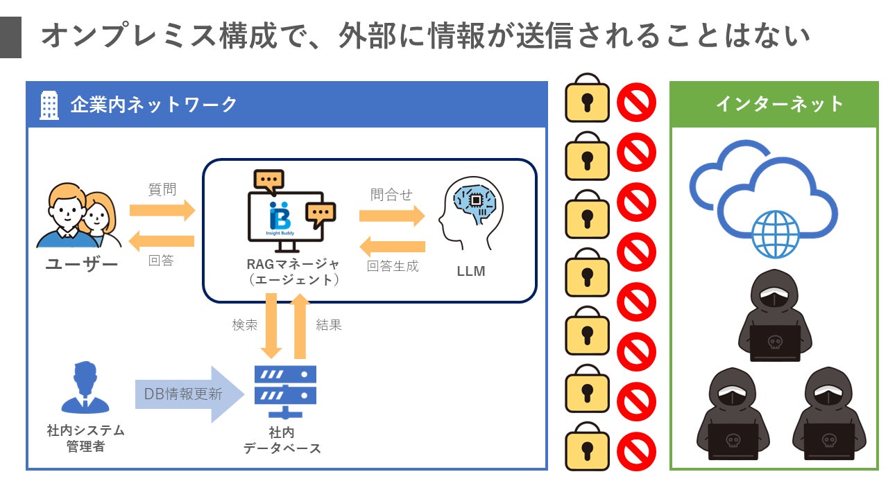 『Insight Buddy』は社内のサーバー上で動作し、RAGによる参照先も社内データに限定することが可能なため、利用者の回答が社外に発信されることは一切ありません。