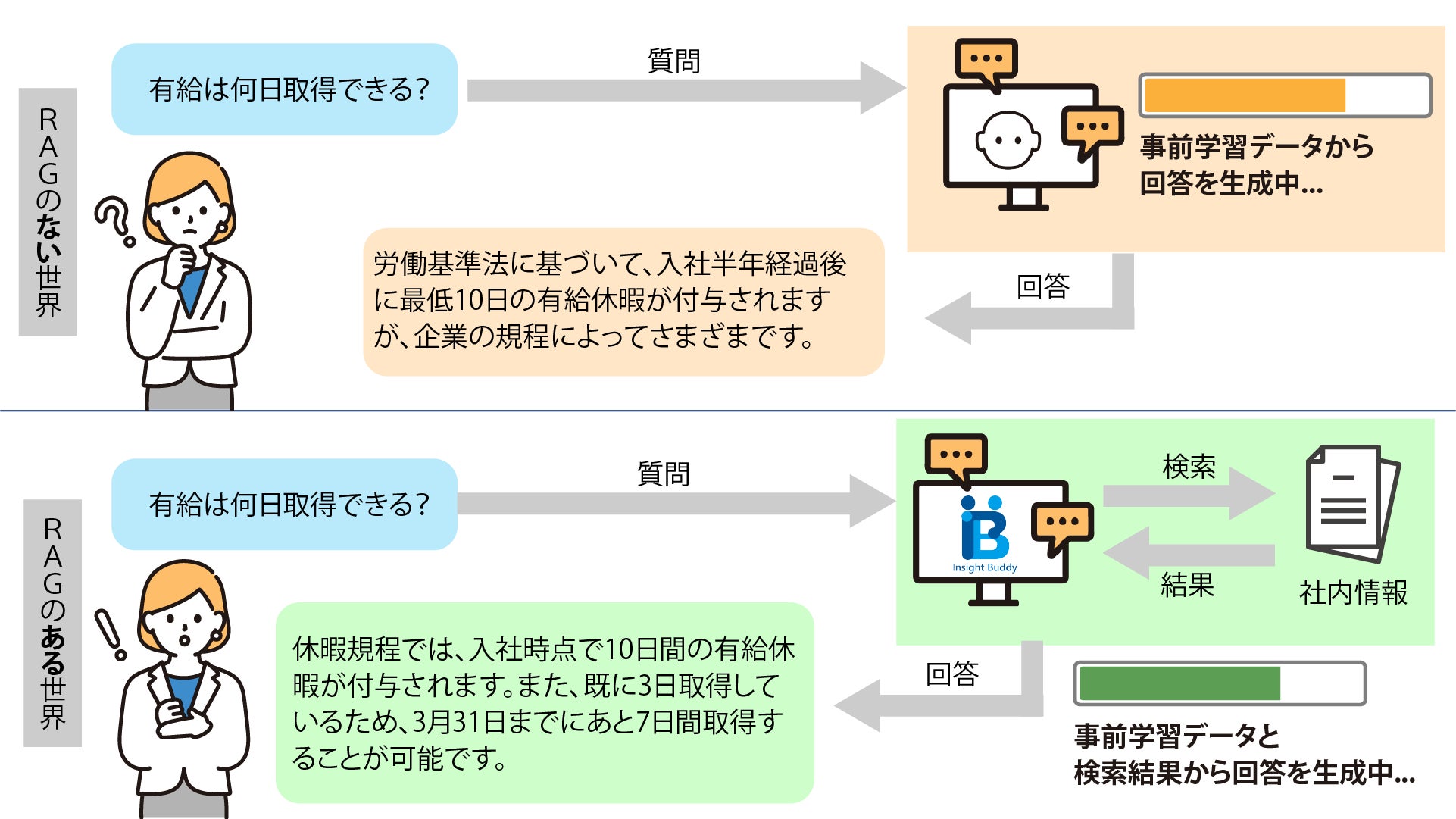 社内データをLLMに追加学習させる場合、膨大な学習時間が必要となりますが、『Insight Buddy』はRAG※5と呼ばれる技術の活用により、LLM自身が随時学習外の情報を検索して回答することで、追加学習の必要なく社内のデータを活用可能となります。さらに、都度の再学習が不要となるため、常に最新の売上データや在庫情報などを活用することができ、日々の状況が経営のカギとなる中小企業にとっては、常に最新の情報をもとにした経営判断ができるという点で最適な環境となりえます。