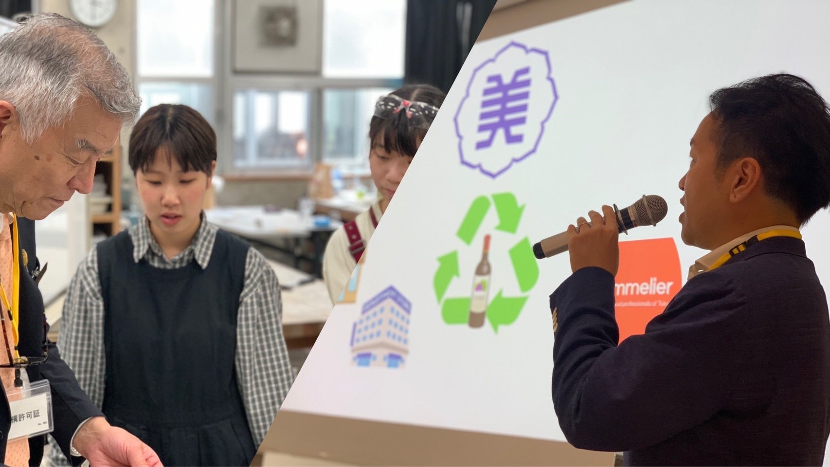 ワインボトルリサイクルプロジェクトのスタートとして、作品作りに挑戦する女子美術大学芸術学部デザイン・工芸学科⼯芸専攻ガラス分野の学生12名に株式会社ソムリエ取締役古澤と江畑が「サステナビリティへの取り組み」についてと今回のワインボトルリサイクルプロジェクトへの思い、ワインについての基礎知識やワイングラスやコルクの豆知識など、普段あまり学生に馴染みのないワインを知ってもらう為の特別講義を実施いたしました。