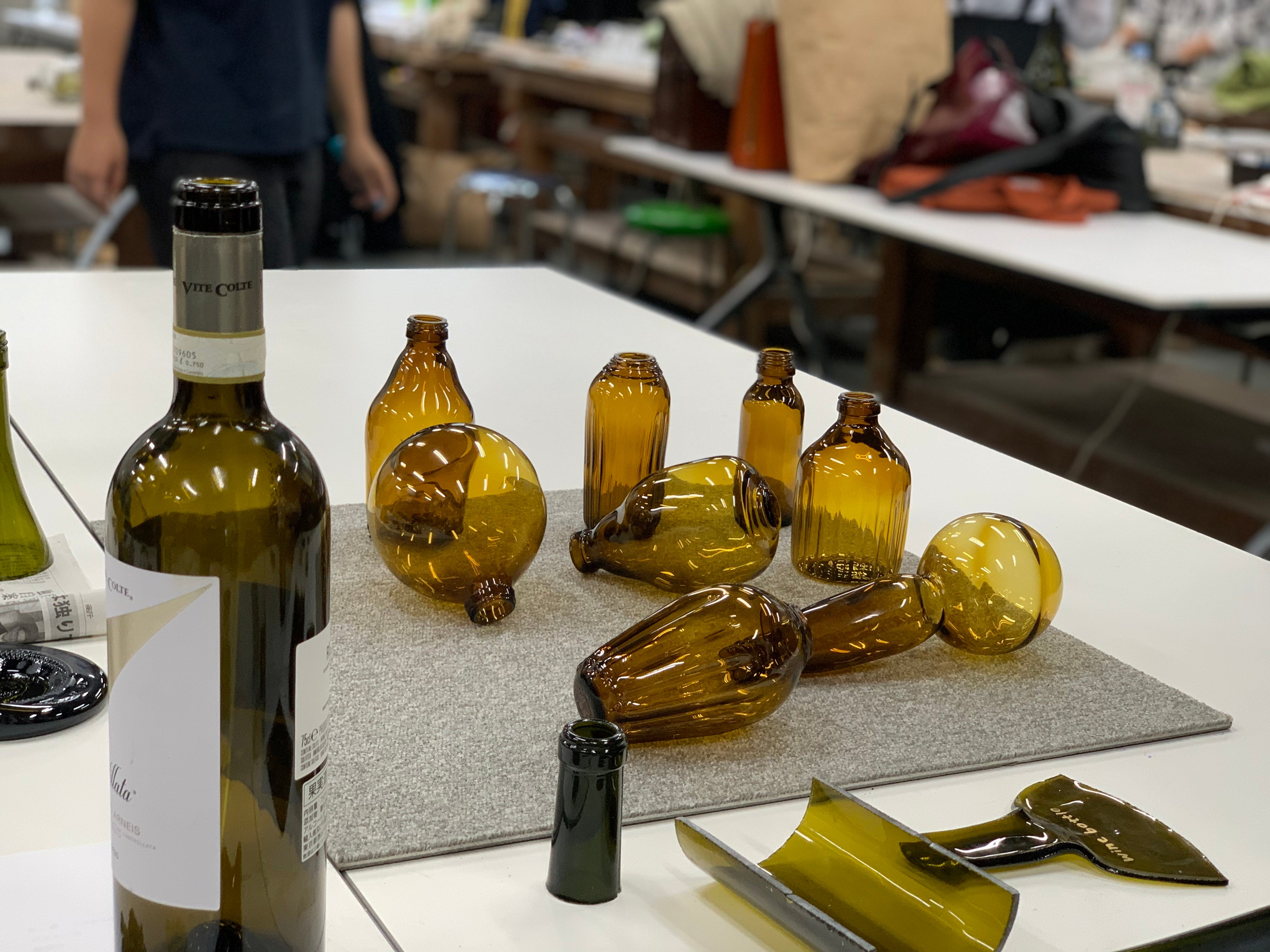 ワインボトルを様々な部分でカットしたり、750度や900度で熱を加えた場合や粉々に砕いた場合など、加える熱の温度の違いや技法の違いで全く異なる物体に変化している実験結果を見て、ここからどんな作品になっていくのか、無限の可能性への期待と、廃棄するはずのボトルが生まれ変わる喜びが感じられました。