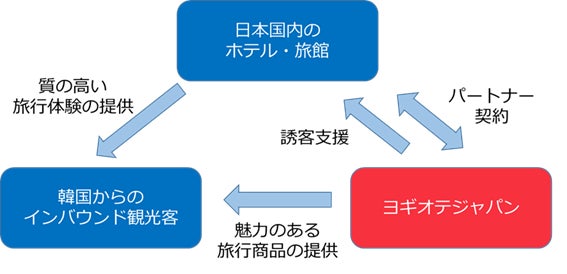 パートナーとなるホテル・旅館とヨギオテジャパンの協業により、韓国からの旅行者に対して魅力的な観光商品を提供するとともに「ヨギオテ」アプリからの直接予約を可能にすることで利便性を高め、韓国からのインバウンド誘客を促進します。また、「ヨギオテ」内でパートナーの詳細な情報提供や推薦をおこない、パートナーのブランドを高めます。さらに、海外でまだ知名度の低い日本国内の観光地に関する情報を「ヨギオテ」を通じ発信し、言語の壁やPR資源の不足により誘客が限られていたホテル・旅館に対して、韓国からのインバウンド観光客受け入れを活性化するための支援を行います。